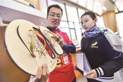 “長榮健豪文化創客空間”日前在天津大學北洋園新校區落成。這個“云印刷”體驗館以“互聯網+印刷”模式運行,使用者可通過網絡,對印刷產品進行個性化定制,制作多種多樣的平面及立體印刷品。同時,創客空間將為大學生提供一個創新與創業、線上與線下、孵化與投資相融合的一體化開放式自主服務平臺。此外,創客空間還將為天大學子提供創業培訓、實踐等。圖為一名工作人員正在展示通過“云印刷”理念“打印”的拖鞋。